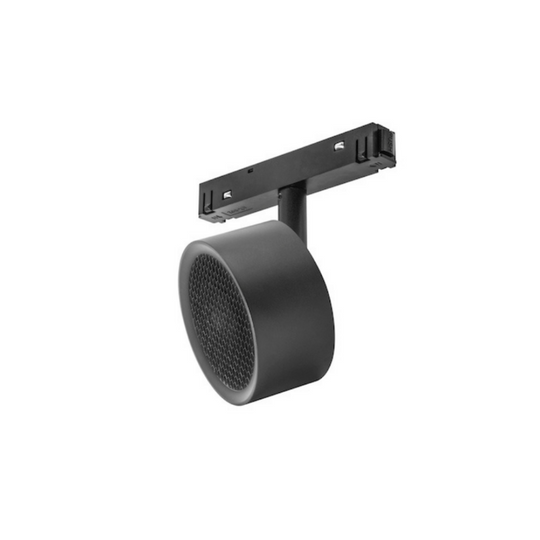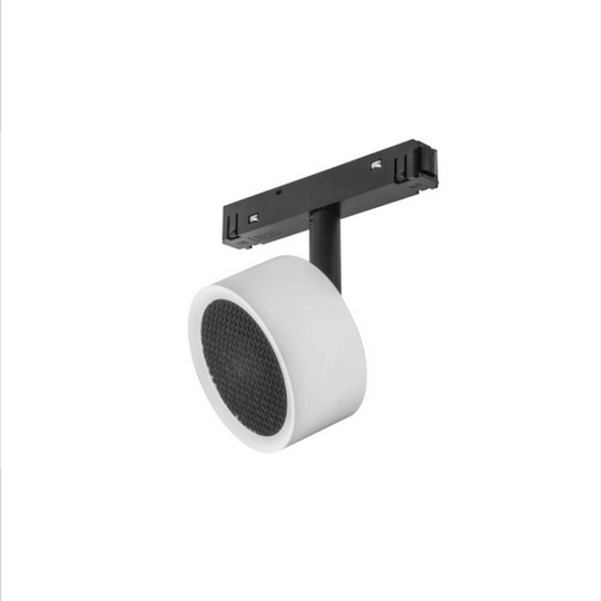 Luminario para riel magnético, sobrepuesto redondo, de LED, con filtro tipo louver honey, blanco cálido, 7 Watts, óptica 24°, UGR 19, aluminio acabado negro o blanco, 48V cc, protección IP20, atenuable